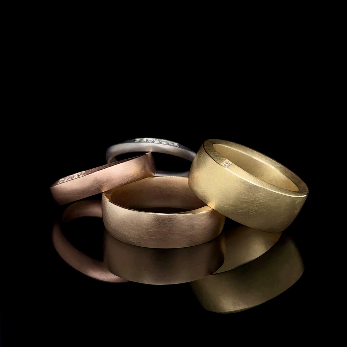 Das Design dieses linsenförmigen und sehr bequemen Ringes zeichnet sich durch seine besondere Seitenansicht aus: Diese ist nicht wie üblich gerade, sondern sie schwingt nach innen und nach außen. So dass die Brillanten, die man hier fassen kann, mal sichtbar sind und mal nicht."